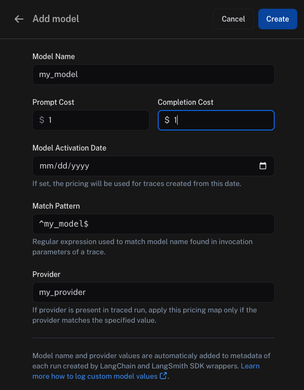 • Match Pattern: A regex pattern to match the model name and provider. This is used to match the value for ls_model_name in the run metadata.